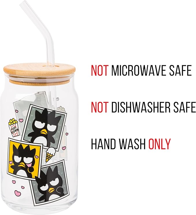 - BADTZ MARU GLASS TUMBLER: This glass tumbler features fan-favorite penguin, Badtz Maru, on three polaroids decorating the glass. Each polaroid showcases a personable image of Badtz Maru. Images are surrounded by pink hearts, ice cream cones, and popcorn buckets.
