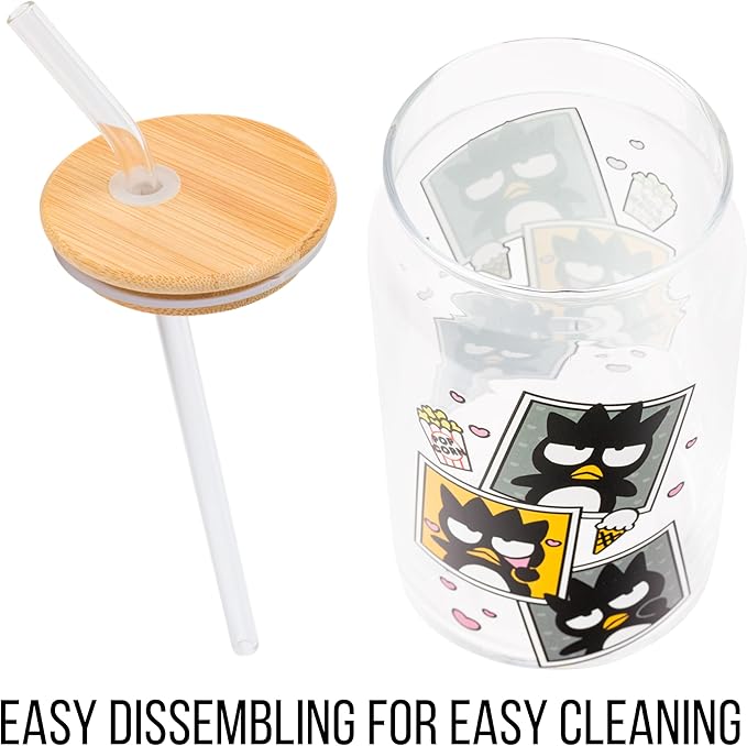 Silver Buffalo Sanrio Hello Kitty and Friends Badtz-Maru Polaroids Glass Jar Tumbler with Bamboo Lid and Glass Straw, 16 Ounces