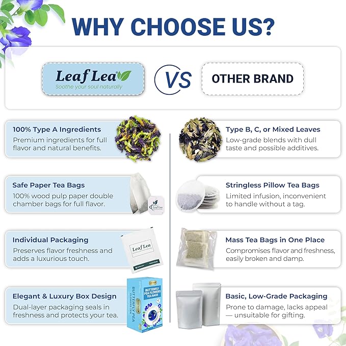 - RICH IN NATURAL NUTRIENTS - Butterfly Pea Flowers are an excellent source of nutrients and vitamins that can provide multiple health benefits, such as boosting immunity and aiding in relaxation. Drinking LeafLea butterfly pea flower tea is a great way to support overall well-being and balance.