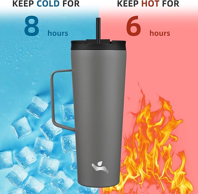 Insulated Tumbler with Handle and Straw, 26 OZ Travel Coffee Mug Stainless Steel Cup Metal Water Bottle,Grey