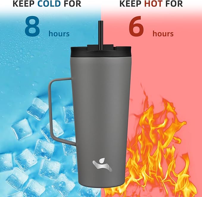 Insulated Tumbler with Handle and Straw, 22 OZ Travel Coffee Mug Stainless Steel Cup Metal Water Bottle,Grey