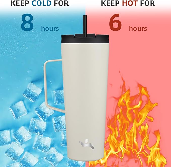 - The tumbler with and and straw is made of food grade stainless steel, double wall vacuum insulation keeps drinks cold for up to 8 hours and hot for up to 6 hours