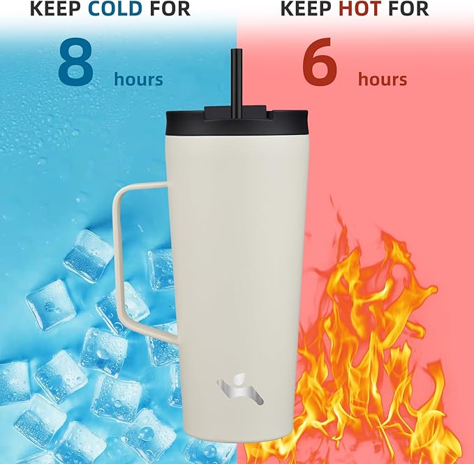 Insulated Tumbler with Handle and Straw, 22 OZ Travel Coffee Mug Stainless Steel Cup Metal Water Bottle,Angel White