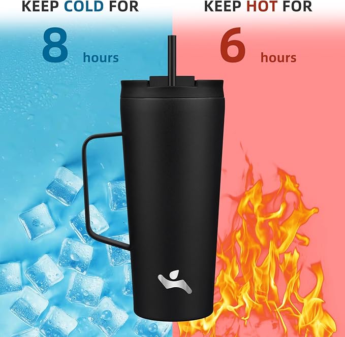 Insulated Tumbler with Handle and Straw, 22 OZ Travel Coffee Mug Stainless Steel Cup Metal Water Bottle,Black