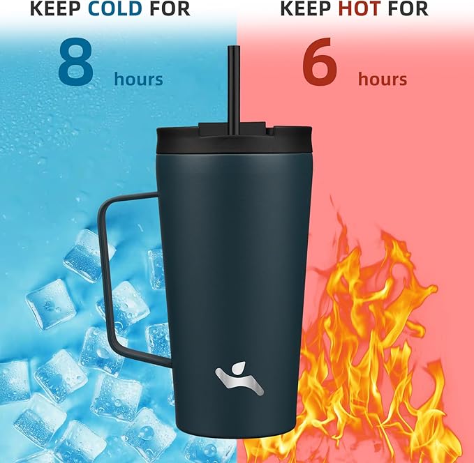 Insulated Tumbler with Handle and Straw, 18 OZ Travel Coffee Mug Stainless Steel Cup Metal Water Bottle,Navy Blue