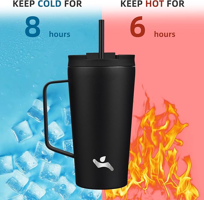 Insulated Tumbler with Handle and Straw, 18 OZ Travel Coffee Mug Stainless Steel Cup Metal Water Bottle,Black