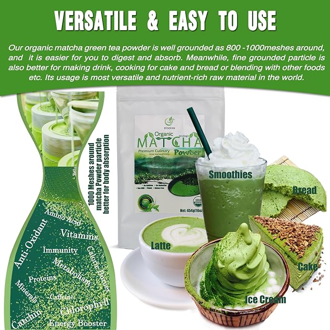 EFOOFAN USDA Organic Matcha Green Tea Powder - Premium Culinary Grade (1lb/16oz) - Rich Tencha Flavor, Antioxidant Polyphenols, Non-GMO, Gluten Free, Naturally Caffeined, Additives Free