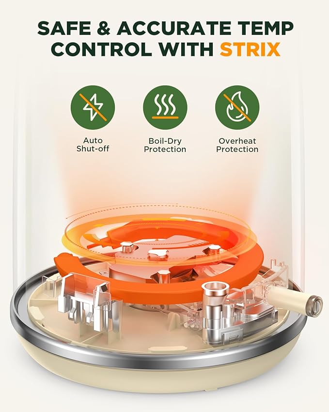 - 🛡️ Triple Safety Assurance: Engineered with STRIX thermostat tech, this hot water kettle electric auto-shuts off at boil, prevents dry-fire disasters, and features cool-touch ergonomic handles. A 360° anti-slip base adds stability for households with kids or pets.