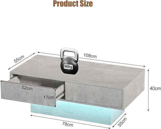 - 【Easy Assemble & After-sales Service】This modern LED coffee table measures 21.6"D x 43.28"W x 19.9"H and has a maximum weight capacity of 110 lbs. Easy to install by following the installation instructions, all accessories and tools are included in the package.If there is any questions please feel free to contact with us, we will response within 24 hours.
