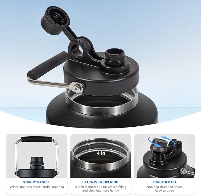 - CRAFTED FOR EASE: Perfect for hiking, camping, outdoor adventures, or those long road trips, our generous gallon-sized stainless steel insulated water jug is effortlessly portable. Boasting a comfortable and a non-slip handle, it's designed for convenience on the move.