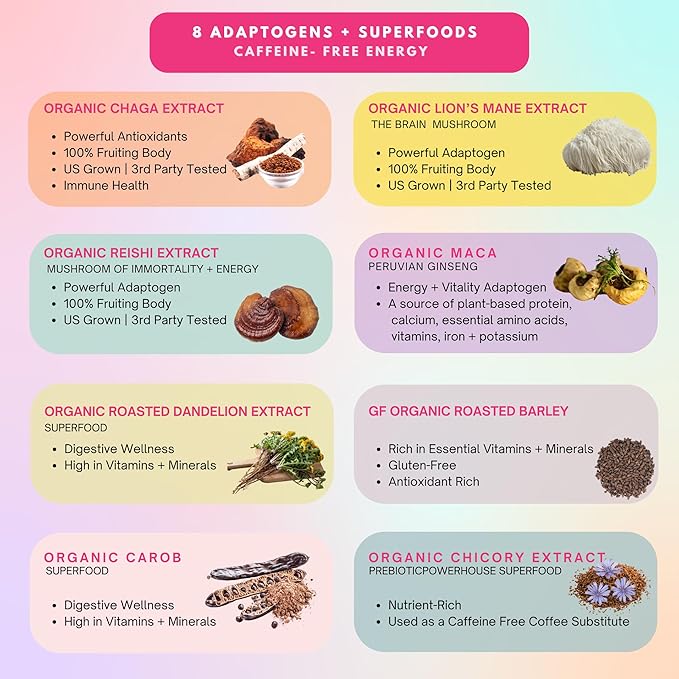 - Healthy Coffee without the Caffeine: Our mushroom blend powder contains 7 adaptogens + superfoods. This combination makes an amazing coffee superfood mushroom mix for coffee add ins for an earlybird morning cocktail.
