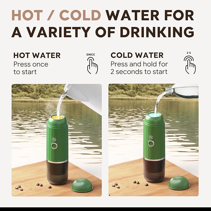 - 2-IN-1 Multi-Function: This travel coffee maker works with ground coffee and coffee capsules . It supports both cold water brew and hot water brew. Brew 5 cups with 50ml cold water and 3 cups with 80ml water cold when fully charged at 25°C / 77°F. Brew one more cup than other similar products. It can also brew 200+ cups with hot water.