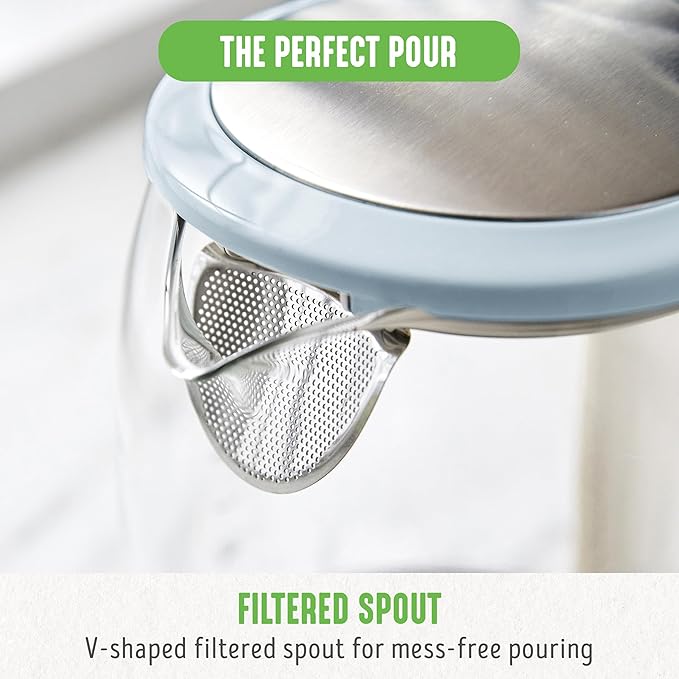 - FILTERED SPOUT: Wide, V-shaped filtered spout for easy and clean pouring