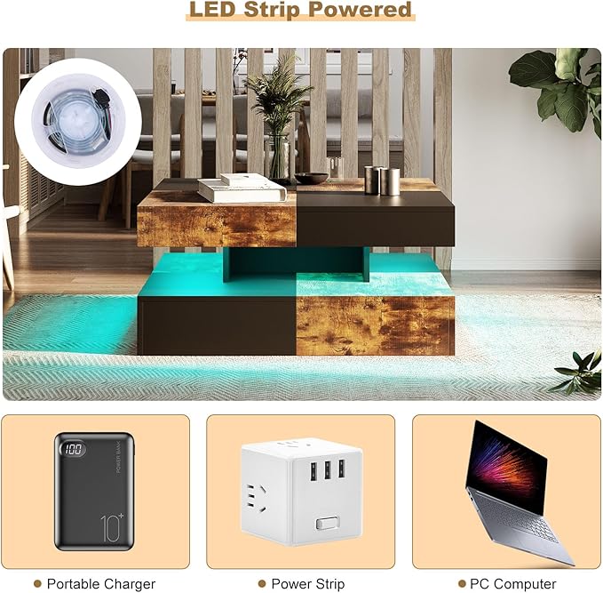 - Contemporary Rustic Brown LED Coffee Table with Solid Construction: This square modern coffee table for living room is constructed with 15mm premium particle board with waterproof melamine surface. Because of its sturdy structure, selected material and exquisite workmanship, this rustic brown LED modern coffee table for living room will last for a long time.