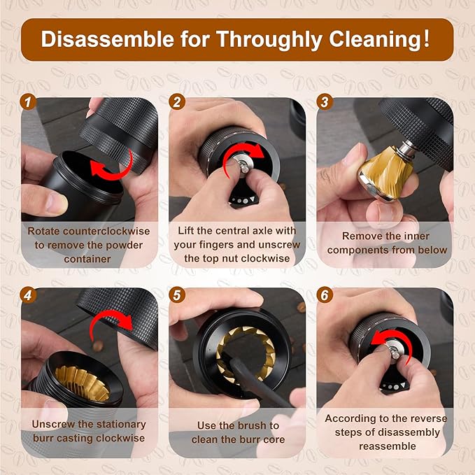 - EASY TO USE & CLEAN ---- You can set the grinding coarseness easily for your customizable coffee flavors with external coarseness adjustment ring.The ergonomic crank handle helps you enjoy the convenience of easy grinding without wrist strain.Our hand coffee bean grinder is easy to disassemble without any tools.You can use the complimentary clean brush to complete the cleaning.
