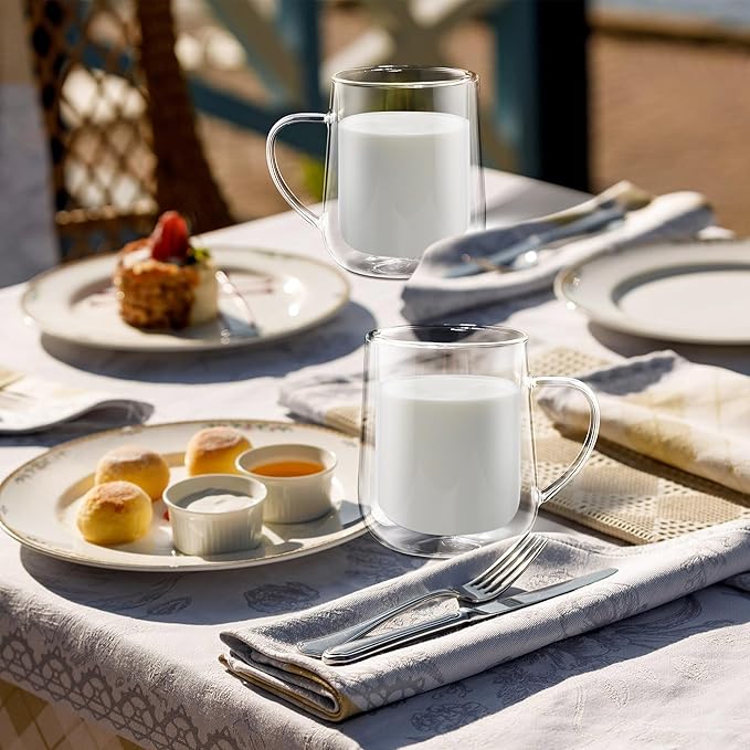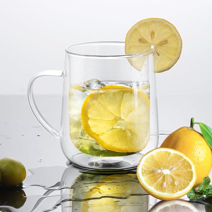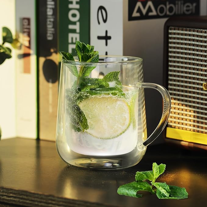 - Double Layer Design With Handle: The double insulated with handle design keeps drinks hot or cold for longer than traditional glasses, keeps the outside of the glass mugs from burning when you hold it and move it around, and prevents condensation on iced drinks. From a distance your drink appears to float in mid-air, making it a great visual experience!