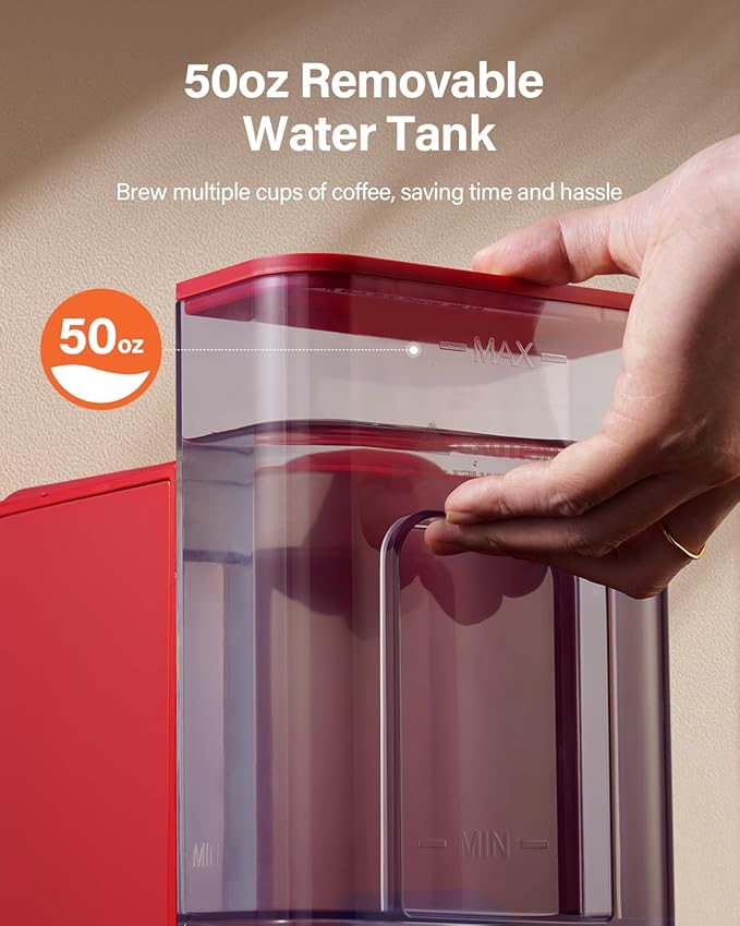 - 50 OZ REMOVABLE WATER TANK: The 50 oz large capacity enables brewing multiple cups of coffee at once, saving time and hassle; the fully visible water tank makes it easy to spot any impurities or build-up inside the tank for cleaning and maintenance