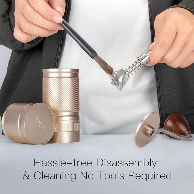 - Easy Cleaning and Disassembly Design: The all-metal integrated burr can be fully detached for easy disassembly and cleaning, allowing you to maintain the grinder effortlessly without the need for extra tools. Simply use the included cleaning brush (do not rinse with water) to keep the stainless steel coffee grinder free from residue, ensuring a fresh grind every time