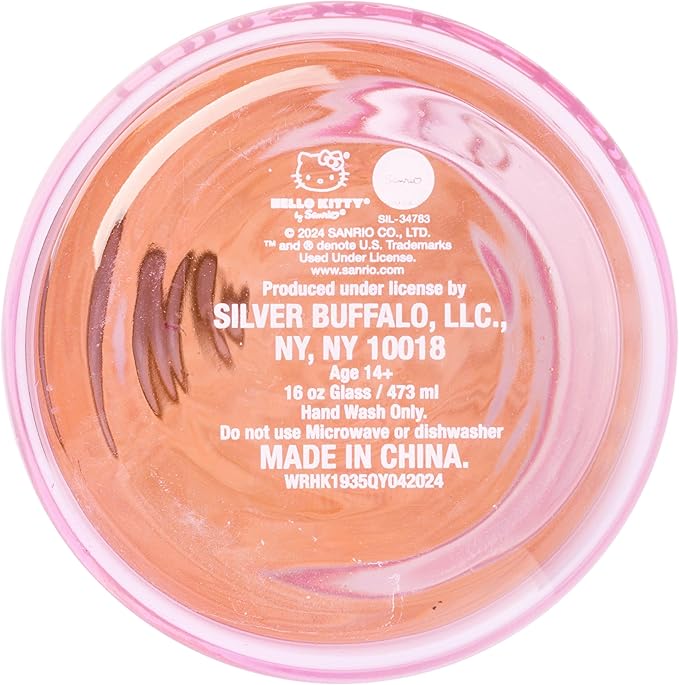 - HELLO KITTY TUMBLER SET: Set includes two glass tumblers. One glass tumbler features a gold image of Hello Kitty with “Hello Kitty” written beneath her. The other tumbler features multiple images of Hello Kitty’s face along with bow designs. Tumblers are pink.