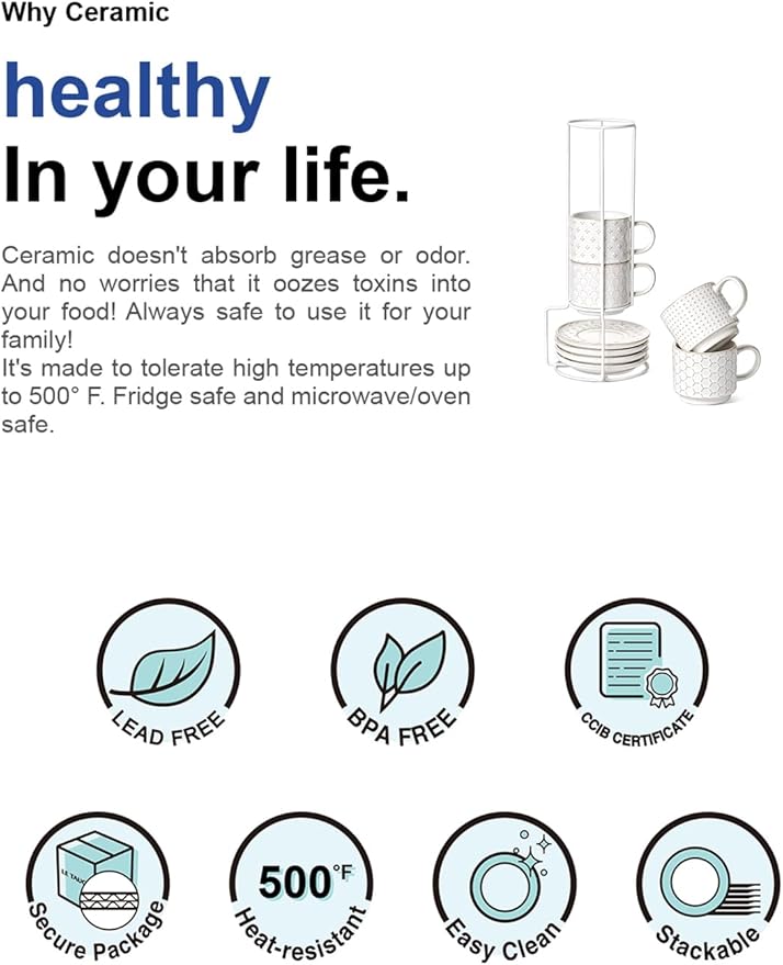 LE TAUCI Stackable Cappuccino Cups 6 oz with Saucers and Stand, Ceramic Embossed Coffee Mugs for Espresso Au Lait, Latte, Cafe, Mocha,Tea, Dishwasher Oven Safe - Set of 4, Arctic white