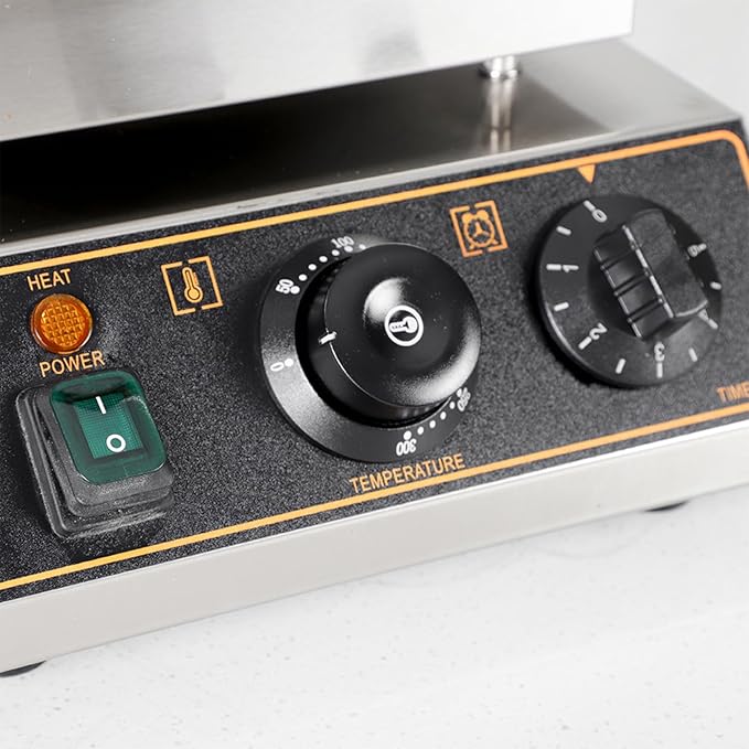 - Time&Temp Control: Precise timer and temperature adjusting knobs with clear scale of 0~5 minutes and 50~300℃. LED light indicates heating status. Clear and melodious alarm when waffle is ready, no need to wait beside any longer.