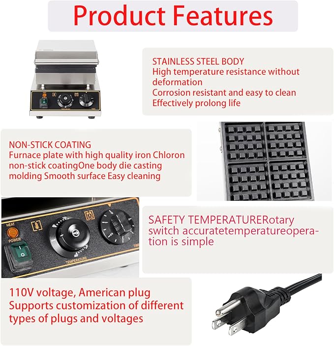 - Wide Application:Square-shaped waffles, soft inside and crispy outside with special flavor, endless aftertaste and alluring smell. Chocolate, candies and other decorations can be added freely to add flavor to warm waffles. Great choice for bakeries, restaurants, kiosks, canteens, etc.