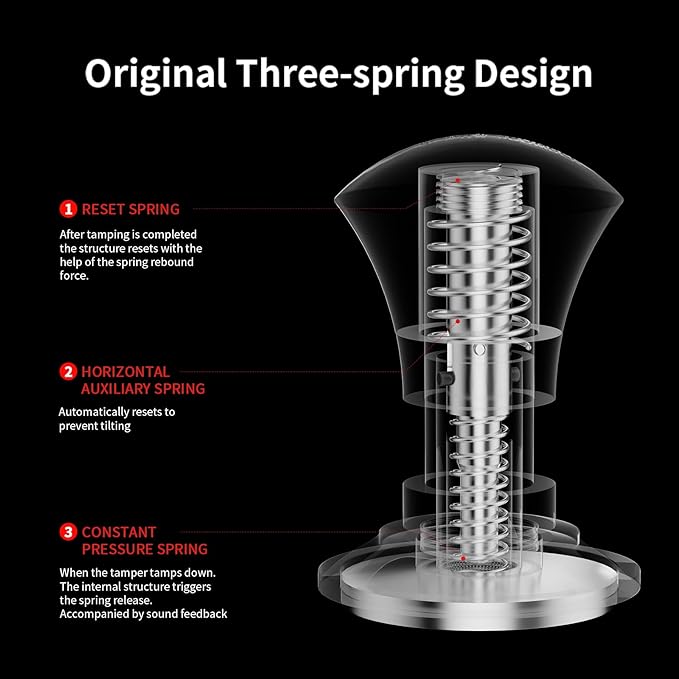 - 【3-Spring Design】This state-of-the-art 58mm coffee tamper features a groundbreaking 3-spring system for precise tamping. Horizontal springs prevent tilting, positioning springs adapt to the required tamping height, and reset springs ensure accurate repositioning after each use.