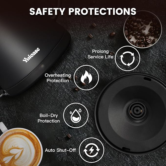 - 【Auto Shutoff & Boil-Dry Protection】 For your safety, always ensure the lid is securely closed when boiling water. The coffee kettle features overheating protection and an automatic shutoff mechanism that prevents it from boiling dry. It will shut off when the water reaches a full boil or when it is nearly empty, ensuring your safe use.