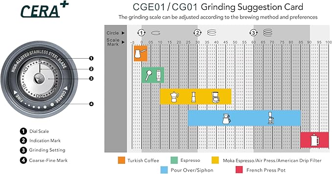 - 【EFFORTLESS OPERATION & EASY CLEANING】CERA+ coffee grinder with ease using one-button operation.Load beans, choose your setting, and press start. All parts are detachable for simple cleaning, saving time and ensuring hygiene.