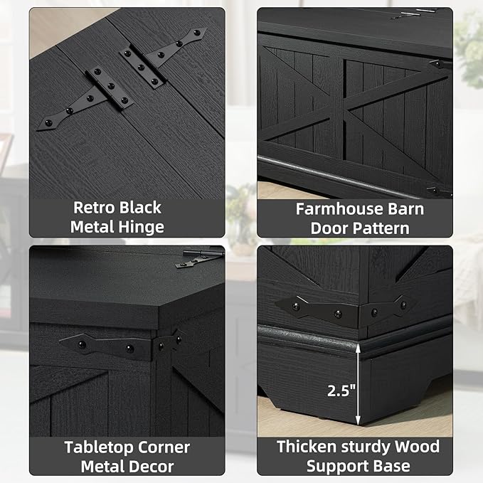 Farmhouse Coffee Table with Large Hidden Storage Compartment, Rustic Black Square Center Table, Wood Low Farm House Modern Living Room Tables with Hinged Lift Top & Wooden Arc Base