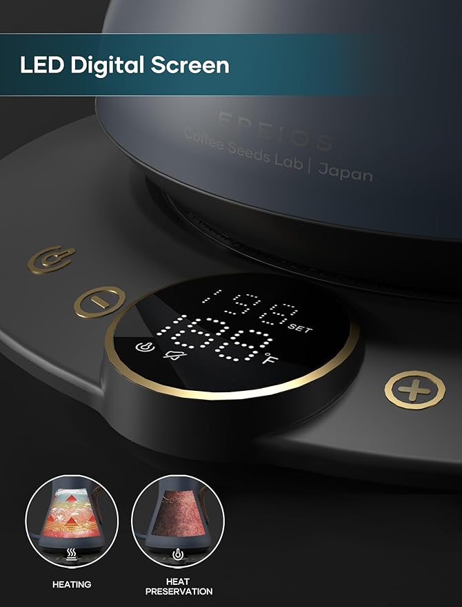 - ±1℉ Temperature Accuracy - The intelligent base's built-in temperature control program. The program will adjust the heating power when the water temp approaches the desired temp according the temp probe detects the temp change.