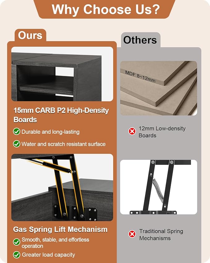 - Quality Materials: This lift coffee table gray is crafted from 15mm CARB P2 engineered wood and solid wood legs, ensuring structural stability and durability. The water-resistant and scratch-resistant surface offers extended longevity