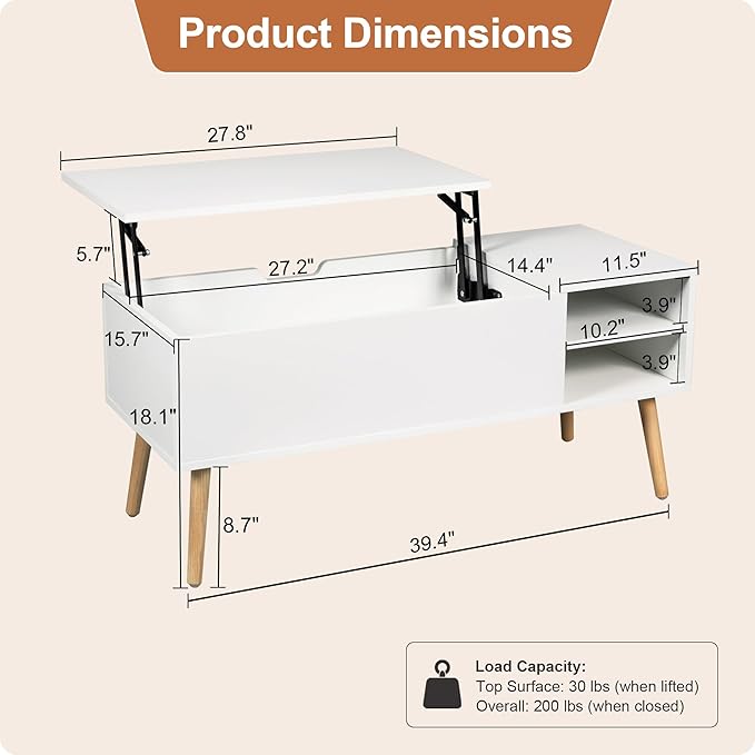 - Lift-Top Modern Design: The cute coffee table that lifts up boasts a mid-century-modern-inspired design with a lift-top tabletop that extends upward, creating an elevated work surface perfect for working, dining, or relaxing in any living space