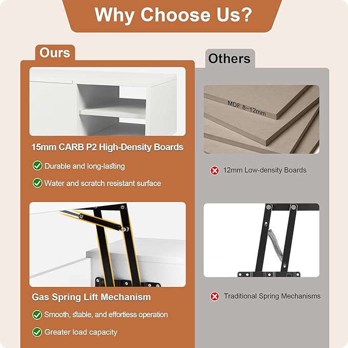 - Quality Materials: This white lift top coffee table is crafted from 15mm CARB P2 engineered wood and solid wood legs, ensuring structural stability and durability. The water-resistant and scratch-resistant surface offers extended longevity