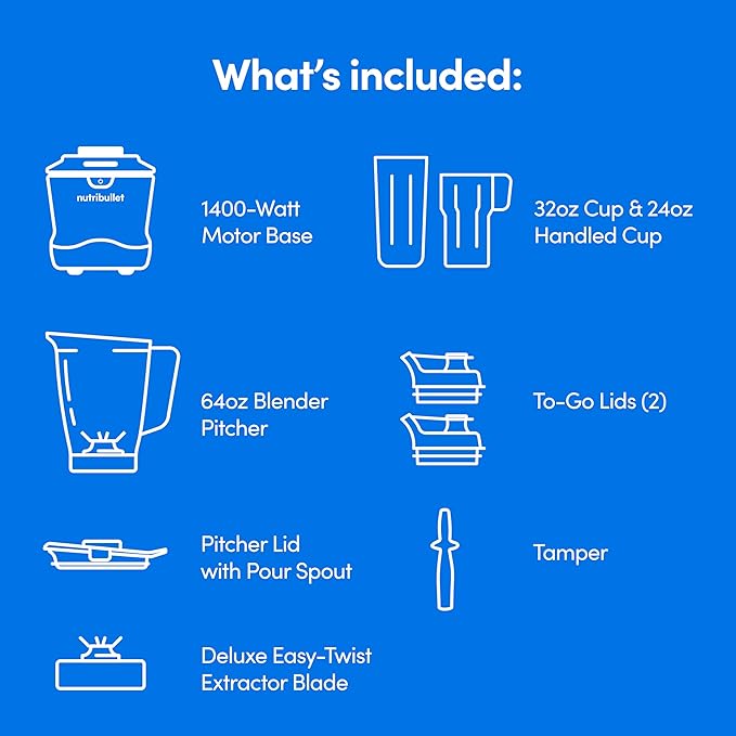 - Included: 1400-WATT MOTOR BASE, 64 OZ BLENDER PITCHER, PITCHER LID WITH POUR SPOUT, DELUXE EASY-TWIST EXTRACTOR BLADE, 32 OZ CUP, 24 OZ HANDLED CUP, 2 TO-GO LIDS, TAMPER, RECIPE BOOK and USER GUIDE.