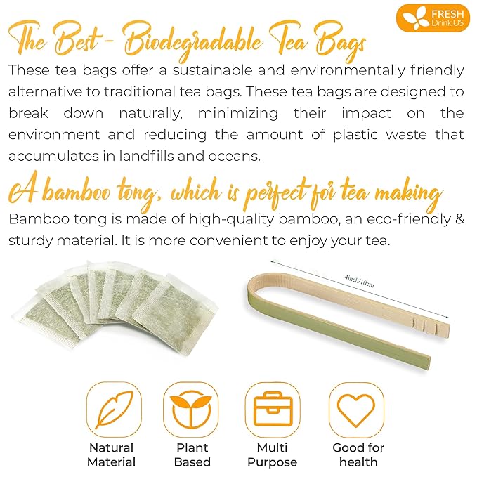 - ☘️ BIODEGRADABLE TEA BAG - NATURAL MATERIAL: The tea bags are made of natural corn fiber, which is friendly and nice for the environment. No Strings. No Wrapped. No Staples. No Adhesive. No Bleach. No Dyes - 100% Safety.