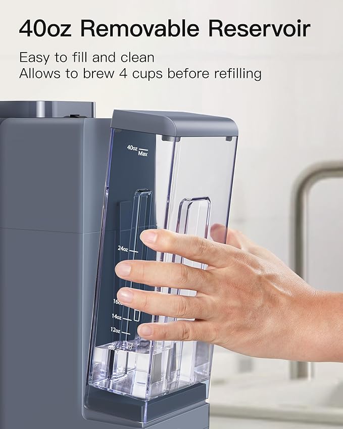- REMOVABLE 40 OZ TANK: Brew 4-5 cups before refilling with the detachable reservoir