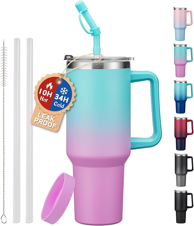 - Super Capacity & Long-Lasting Temperature Control: Stay refreshed with fewer refills—keeps drinks cold for 34 hours and hot for 10 hours thanks to triple-wall vacuum insulation. The slim base fits most car cup holders, while the ergonomic handle ensures easy carrying to work, the gym, or on trips