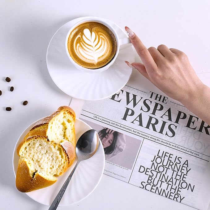 - [Anti-Slip Design] Comes with a matching saucer to ensure the cup and saucer fit perfectly, providing stability and preventing accidental slips or spills, perfect for dining table, weddings, cafes, afternoon or tea.The smooth interior and wide rim make it ideal for creating coffee art, allowing you to craft stunning designs effortlessly