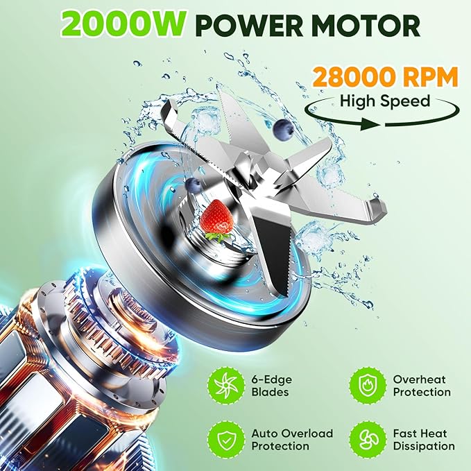 - 🍍PROFESSIONAL POWER: Our power blender for smoothie equiped with 2000 Peak Watt industrial-grade powerful motor to get the perfect texture, pulverizes crush ice to snow in seconds, can handle a variety of ingredients easily. Unique fan and motor technology, reduce operating noise.