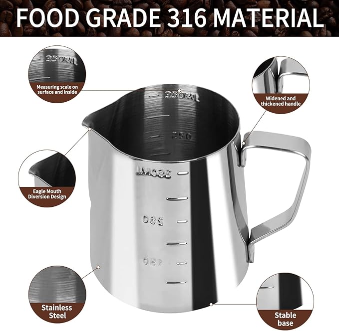 - High quality food-grade316stainlesss teel Premium Materials milk frother marked with scales on the inside and outside for easy and accurate measurements ergonomic handle for it is dishwasher safe