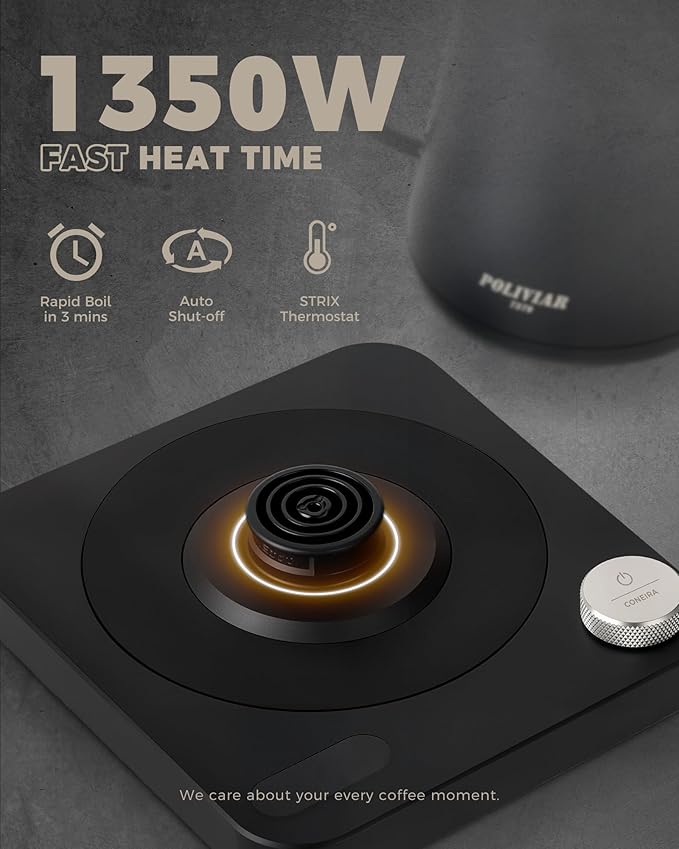 - FAST BOIL TECHNOLOGY: The electric water kettle boils water in just 3 minutes with a powerful 1350W heating element. The electric kettle features an automatic shut-off for safety when the water reaches boiling or when the kettle is empty.