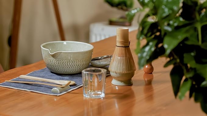 - YABERCHA MATCHA TEA SET (10 PCS): Ceramic Matcha Bowl with Spout, Bamboo Whisk (Chasen), Whisk Holder (Chasen Holder), Bamboo Spoon (Chashaku), Matcha Tea Sifter, Spoon Holder, Cotton Tea Towel, Wooden Measuring Spoon, Measuring Cup, Cleaning Brush