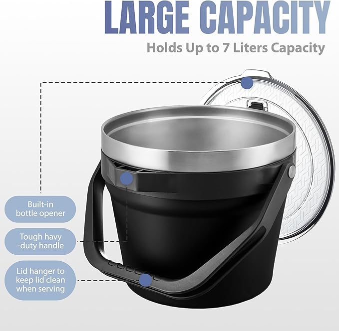 COKTIK 7L Vacuum Insulated Ice Bucket with Lid and Scoop& Tongs,Large capacity Stainless Steel Beverage Bucket for Cocktail, Champagne, Wine, Beer,Large Parties(Carbon Black Suit)