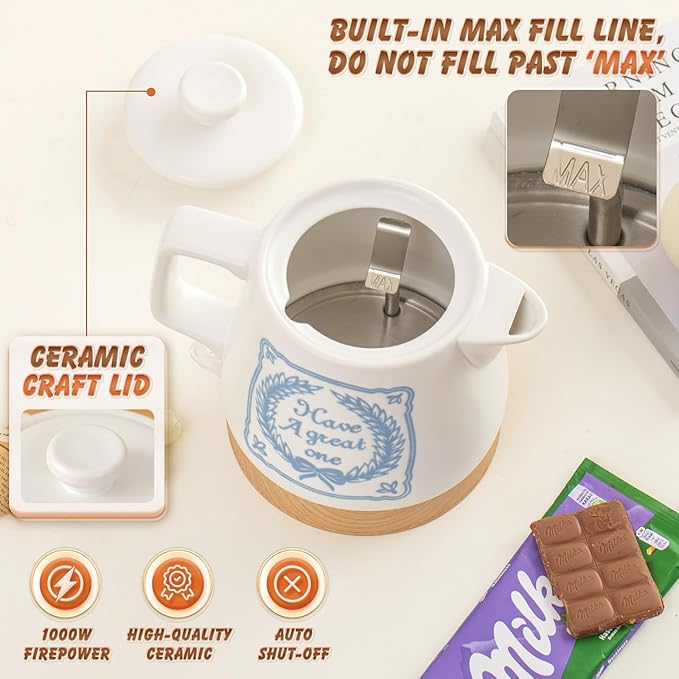 - Fast Boiling: 1000 watt Heating power,this ceramic electric kettle boils up to 1 liter (1 qt) of water faster than a microwave and safer than a stovetop pot. No need to wait for a long time, brew hot tea or coffee anytimeperfect for hectic mornings. Good Kitchen Assistant