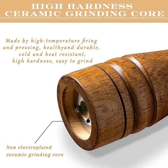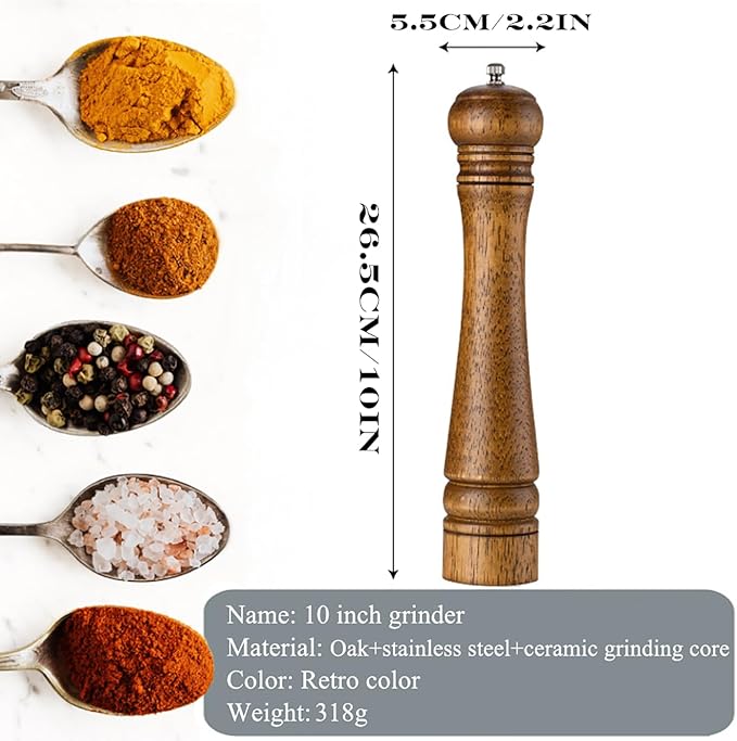 - High Quality Oak:Our pepper grinder is made of high-quality oak, ensuring durability and natural beauty, and will look beautiful in any kitchen. Its classic and rustic charm can enhance the overall appearance of your dining table or countertop.