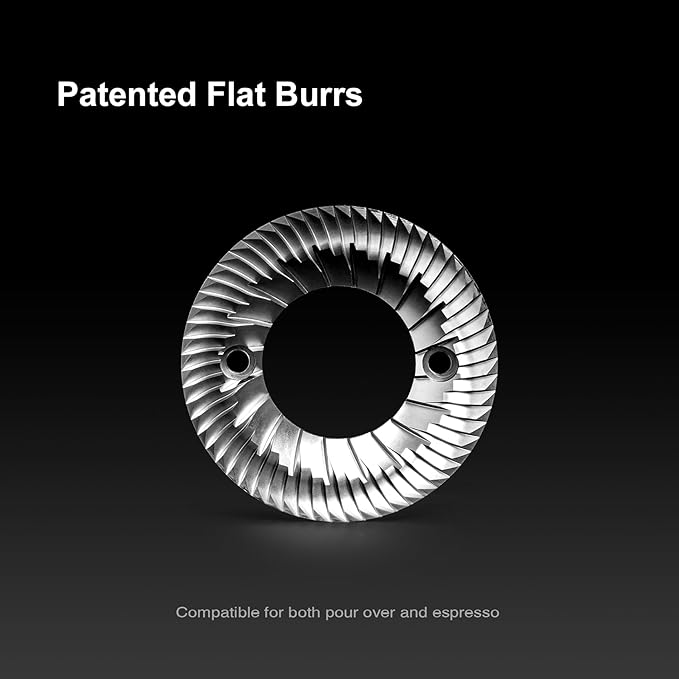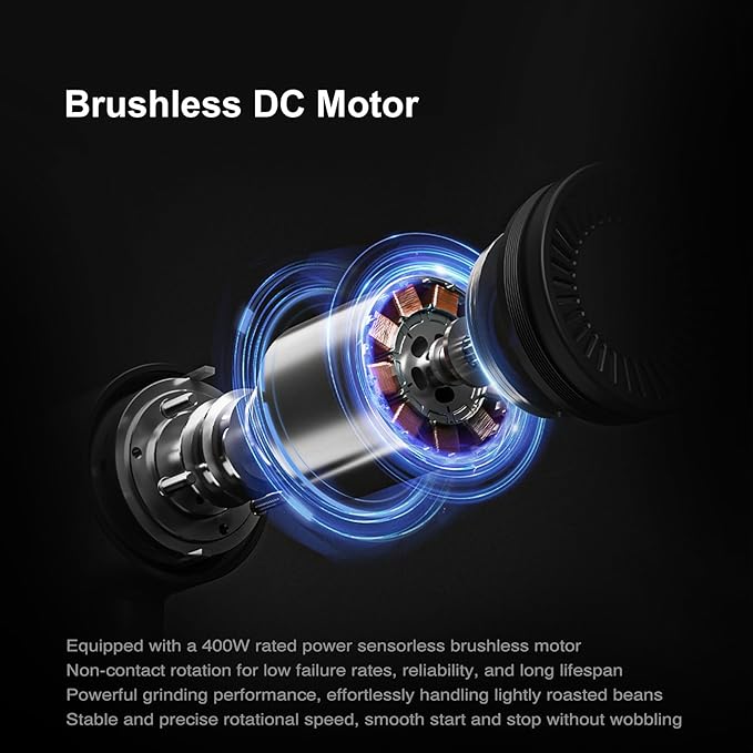 - [ Sensory Brushless Motor ] Our Burr Coffee Grinder uses a zero-friction motor with PID control and Hall elements for smoother operation, longer lifespan, and greater stability. Unlike traditional brushed motors, it doesnโt shake during use, providing a more precise grind every time.