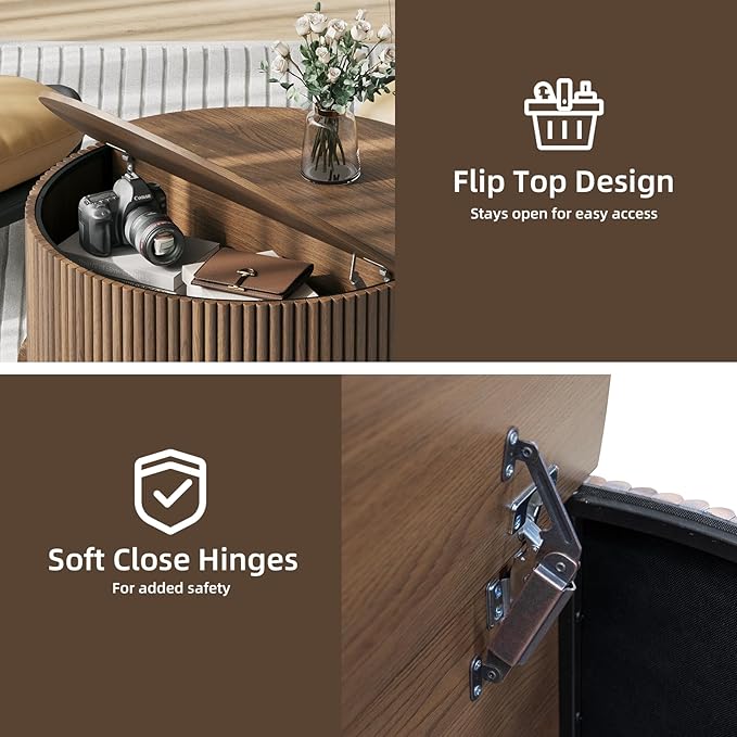 Round Coffee Table with Storage, Mid Century Modern Center Table with Sliding Cabinet Door, Fluted Dining Table for Living Room, Home Small Space, 31.5", Walnut
