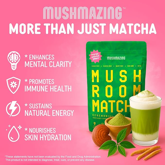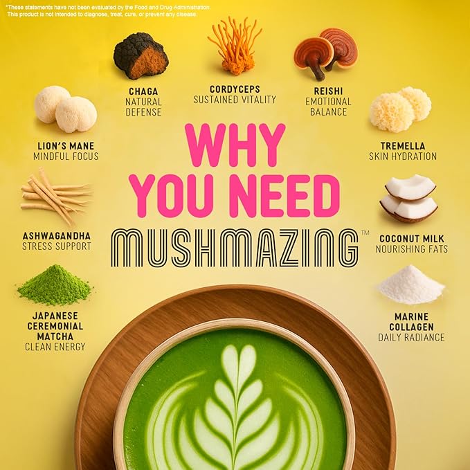 - SMOOTH, BALANCED ENERGY – ceremonial grade matcha powder blended with Lion’s Mane, Reishi, Chaga, Cordyceps, Tremella, ashwagandha, and marine collagen for a creamy, functional latte mix.