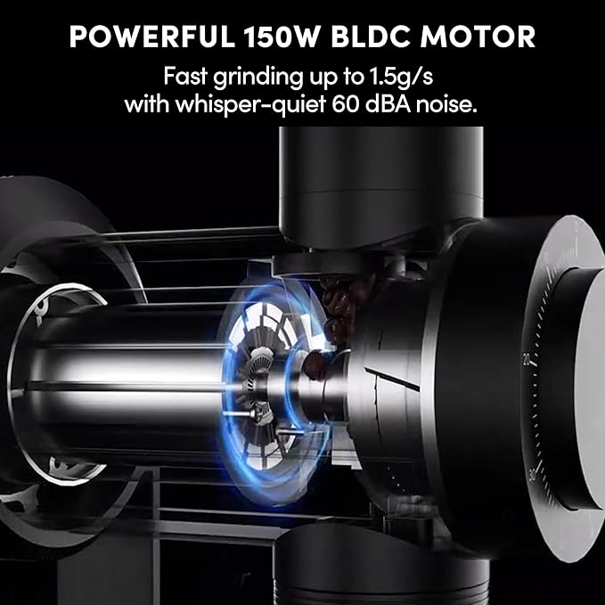 - 【Powerful 150W BLDC Motor】Equipped with a high-performance 150W BLDC motor, this electric coffee grinder grinds up to 1.5 g/s while operating at just 60 dBA, —among the quietest in its class. Built to last up to 3× longer than traditional motors, it delivers powerful yet whisper-quiet performance for years to come.